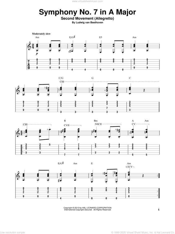 This new feature (still experimental) allows you to ask questions related to this music title to our AI music assistant (powered by OpenAI ChatGPT), trained to answer as an expert on this music title.You may ask questions like "When was this piece written?" or "How would you suggest approaching this piece?" You can also ask questions about the author or anything else you may think of. Just enter your queries inside the field on the top of the displayed music and click the "Ask" button on the left to start chatting. Remember that the assistant cannot perform catalog searches. It is focused only on this music title. It could also give you wrong or imperfect answers. In that case, click the "regenerate" button on the side of the answer to replace it with a new one. And, of course, you can provide feedback for each answer so we can improve the system. ![]() Ludwig van Beethoven: Symphony No. 7 In A Major, Second Movement (Allegretto) for guitar solo, intermediate guitar sheet music. Includes an High-Quality PDF file to download instantly. Licensed to Virtual Sheet Music® by Hal Leonard® publishing company. NOTE: The image above is just a preview of the first page of this item. Buy this item to display, print, and enjoy the complete music. Basic Score Info