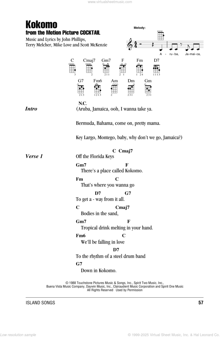 This new feature (still experimental) allows you to ask questions related to this music title to our AI music assistant (powered by OpenAI ChatGPT), trained to answer as an expert on this music title.You may ask questions like "When was this song written?" or "How would you suggest approaching this song?" You can also ask questions about the author or anything else you may think of. Just enter your queries inside the field on the top of the displayed music and click the "Ask" button on the left to start chatting. Remember that the assistant cannot perform catalog searches. It is focused only on this music title. It could also give you wrong or imperfect answers. In that case, click the "regenerate" button on the side of the answer to replace it with a new one. And, of course, you can provide feedback for each answer so we can improve the system. ![]() The Beach Boys: Kokomo for ukulele (chords), intermediate sheet music. Includes an High-Quality PDF file to download instantly. Licensed to Virtual Sheet Music® by Hal Leonard® publishing company. NOTE: The image above is just a preview of the first page of this item. Buy this item to display, print, and enjoy the complete music. Basic Score Info