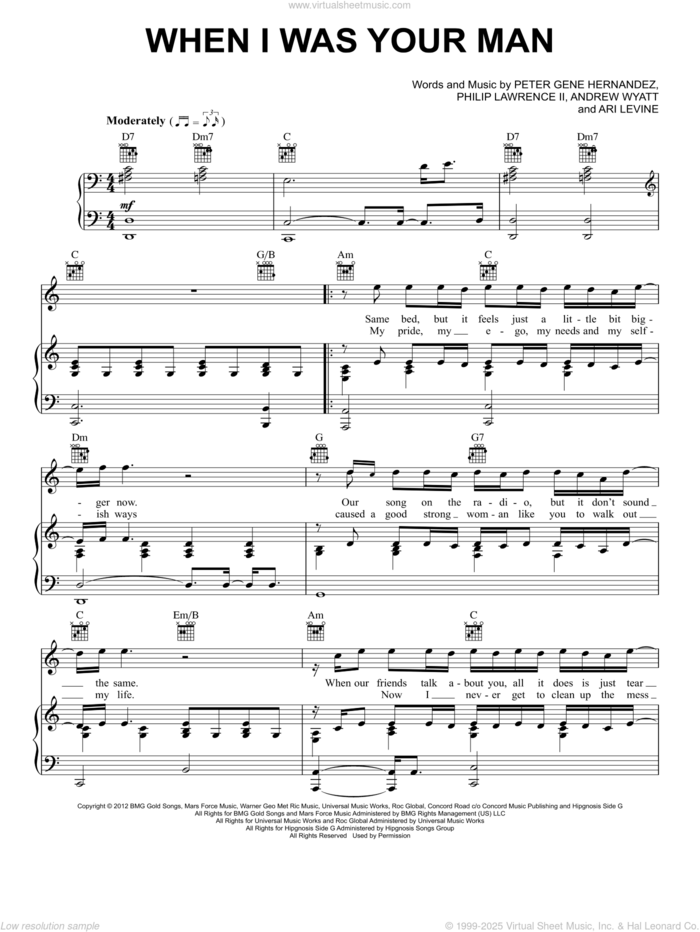 This new feature (still experimental) allows you to ask questions related to this music title to our AI music assistant (powered by OpenAI ChatGPT), trained to answer as an expert on this music title.You may ask questions like "When was this song written?" or "How would you suggest approaching this song?" You can also ask questions about the author or anything else you may think of. Just enter your queries inside the field on the top of the displayed music and click the "Ask" button on the left to start chatting. Remember that the assistant cannot perform catalog searches. It is focused only on this music title. It could also give you wrong or imperfect answers. In that case, click the "regenerate" button on the side of the answer to replace it with a new one. And, of course, you can provide feedback for each answer so we can improve the system. ![]() Bruno Mars: When I Was Your Man for voice, piano or guitar, intermediate sheet music. High-Quality and Interactive, transposable in any key, play along. Includes an High-Quality PDF file to download instantly. Licensed to Virtual Sheet Music® by Hal Leonard® publishing company. NOTE: The sample above is just the first page preview of this item. Buy this item to display, print, and play the complete music. Basic Score Info