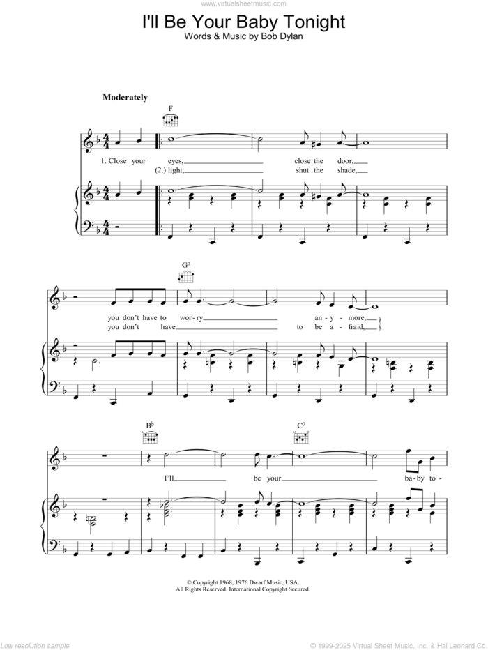 This new feature (still experimental) allows you to ask questions related to this music title to our AI music assistant (powered by OpenAI ChatGPT), trained to answer as an expert on this music title.You may ask questions like "When was this song written?" or "How would you suggest approaching this song?" You can also ask questions about the author or anything else you may think of. Just enter your queries inside the field on the top of the displayed music and click the "Ask" button on the left to start chatting. Remember that the assistant cannot perform catalog searches. It is focused only on this music title. It could also give you wrong or imperfect answers. In that case, click the "regenerate" button on the side of the answer to replace it with a new one. And, of course, you can provide feedback for each answer so we can improve the system. ![]() Bob Dylan: I'll Be Your Baby Tonight for voice, piano or guitar, intermediate sheet music. Includes an High-Quality PDF file to download instantly. Licensed to Virtual Sheet Music® by Hal Leonard® publishing company. NOTE: The image above is just a preview of the first page of this item. Buy this item to display, print, and enjoy the complete music. Basic Score Info