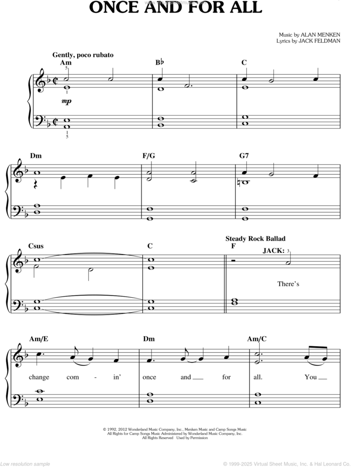 This new feature (still experimental) allows you to ask questions related to this music title to our AI music assistant (powered by OpenAI ChatGPT), trained to answer as an expert on this music title.You may ask questions like "When was this song written?" or "How would you suggest approaching this song?" You can also ask questions about the author or anything else you may think of. Just enter your queries inside the field on the top of the displayed music and click the "Ask" button on the left to start chatting. Remember that the assistant cannot perform catalog searches. It is focused only on this music title. It could also give you wrong or imperfect answers. In that case, click the "regenerate" button on the side of the answer to replace it with a new one. And, of course, you can provide feedback for each answer so we can improve the system. ![]() Alan Menken: Once And For All (from Newsies) for piano solo, easy piano sheet music. High-Quality and Interactive, transposable in any key, play along. Includes an High-Quality PDF file to download instantly. Licensed to Virtual Sheet Music® by Hal Leonard® publishing company. NOTE: The sample above is just the first page preview of this item. Buy this item to display, print, and play the complete music. Basic Score Info