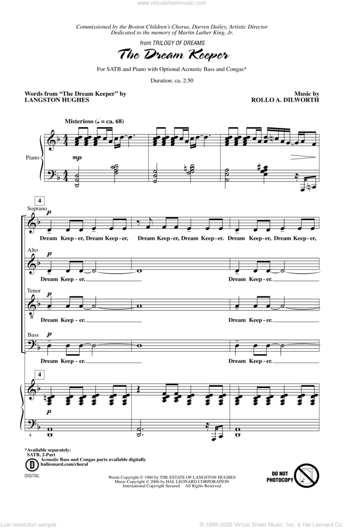 This new feature (still experimental) allows you to ask questions related to this music title to our AI music assistant (powered by OpenAI ChatGPT), trained to answer as an expert on this music title.You may ask questions like "When was this song written?" or "How would you suggest approaching this song?" You can also ask questions about the author or anything else you may think of. Just enter your queries inside the field on the top of the displayed music and click the "Ask" button on the left to start chatting. Remember that the assistant cannot perform catalog searches. It is focused only on this music title. It could also give you wrong or imperfect answers. In that case, click the "regenerate" button on the side of the answer to replace it with a new one. And, of course, you can provide feedback for each answer so we can improve the system. ![]() Rollo Dilworth: The Dream Keeper (from Trilogy of Dreams) for choir (SATB: soprano, alto, tenor, bass), intermediate sheet music. Includes an High-Quality PDF file to download instantly. Licensed to Virtual Sheet Music® by Hal Leonard® publishing company. NOTE: The image above is just a preview of the first page of this item. Buy this item to display, print, and enjoy the complete music. Basic Score Info