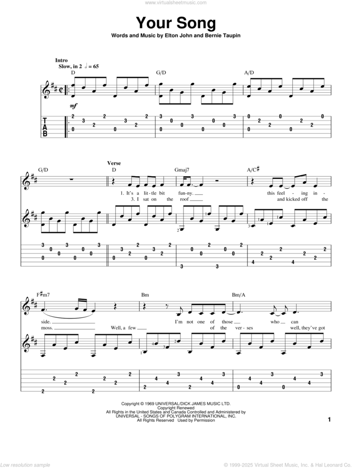 This new feature (still experimental) allows you to ask questions related to this music title to our AI music assistant (powered by OpenAI ChatGPT), trained to answer as an expert on this music title.You may ask questions like "When was this song written?" or "How would you suggest approaching this song?" You can also ask questions about the author or anything else you may think of. Just enter your queries inside the field on the top of the displayed music and click the "Ask" button on the left to start chatting. Remember that the assistant cannot perform catalog searches. It is focused only on this music title. It could also give you wrong or imperfect answers. In that case, click the "regenerate" button on the side of the answer to replace it with a new one. And, of course, you can provide feedback for each answer so we can improve the system. ![]() Elton John: Your Song, (intermediate) for guitar solo, intermediate guitar sheet music. Includes an High-Quality PDF file to download instantly. Licensed to Virtual Sheet Music® by Hal Leonard® publishing company. NOTE: The image above is just a preview of the first page of this item. Buy this item to display, print, and enjoy the complete music. Basic Score Info