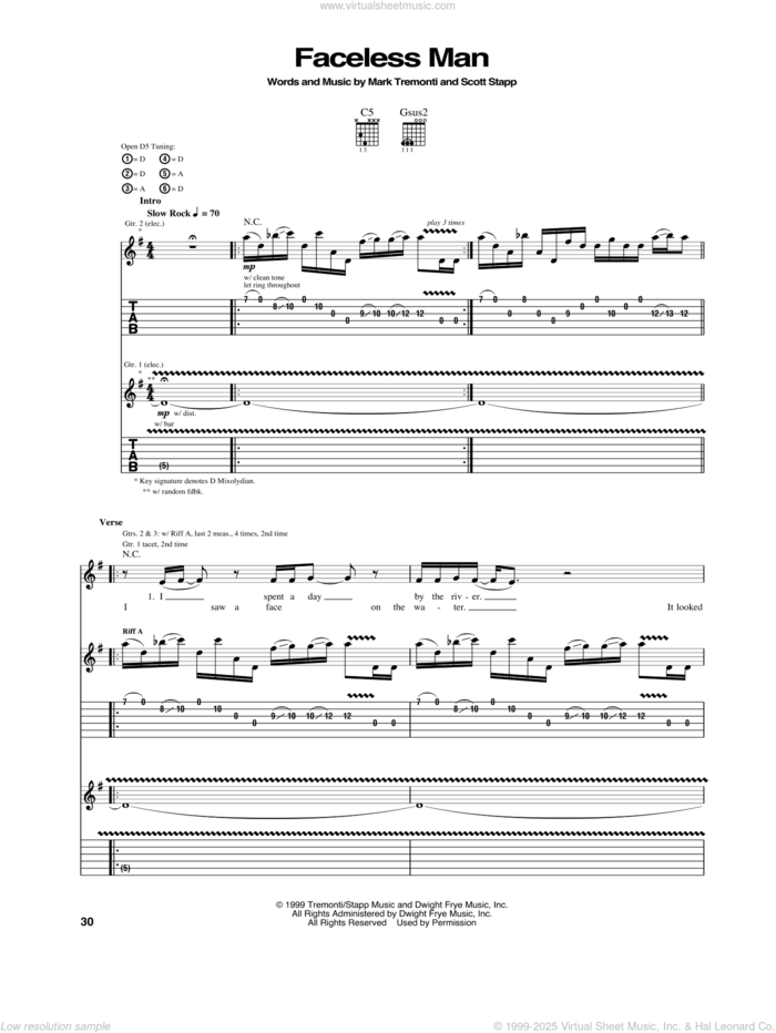 This new feature (still experimental) allows you to ask questions related to this music title to our AI music assistant (powered by OpenAI ChatGPT), trained to answer as an expert on this music title.You may ask questions like "When was this song written?" or "How would you suggest approaching this song?" You can also ask questions about the author or anything else you may think of. Just enter your queries inside the field on the top of the displayed music and click the "Ask" button on the left to start chatting. Remember that the assistant cannot perform catalog searches. It is focused only on this music title. It could also give you wrong or imperfect answers. In that case, click the "regenerate" button on the side of the answer to replace it with a new one. And, of course, you can provide feedback for each answer so we can improve the system. ![]() Creed: Faceless Man for guitar (tablature), intermediate sheet music. Includes an High-Quality PDF file to download instantly. Licensed to Virtual Sheet Music® by Hal Leonard® publishing company. NOTE: The image above is just a preview of the first page of this item. Buy this item to display, print, and enjoy the complete music. Basic Score Info
