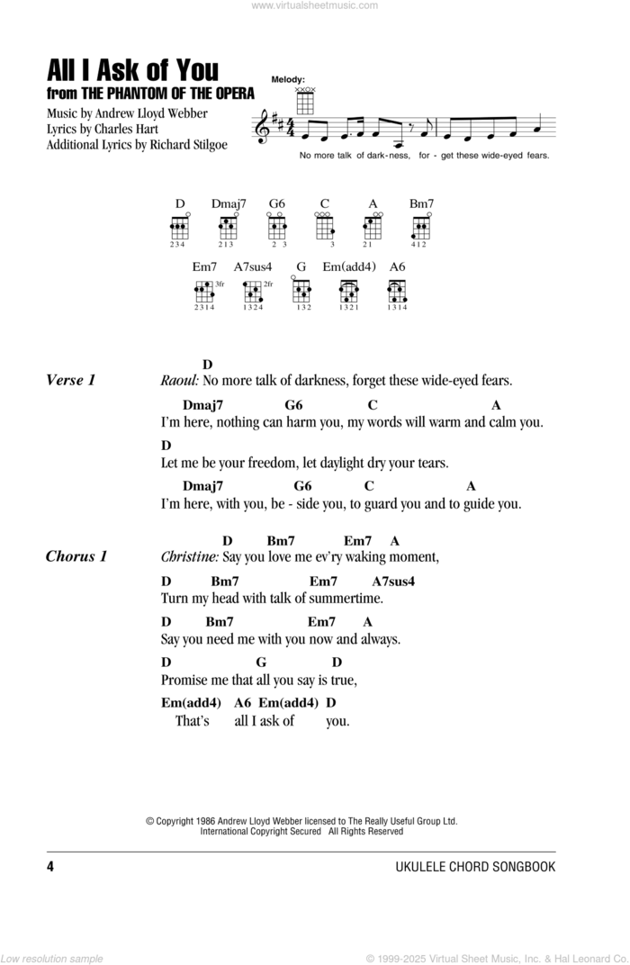 This new feature (still experimental) allows you to ask questions related to this music title to our AI music assistant (powered by OpenAI ChatGPT), trained to answer as an expert on this music title.You may ask questions like "When was this song written?" or "How would you suggest approaching this song?" You can also ask questions about the author or anything else you may think of. Just enter your queries inside the field on the top of the displayed music and click the "Ask" button on the left to start chatting. Remember that the assistant cannot perform catalog searches. It is focused only on this music title. It could also give you wrong or imperfect answers. In that case, click the "regenerate" button on the side of the answer to replace it with a new one. And, of course, you can provide feedback for each answer so we can improve the system. ![]() Barbra Streisand: All I Ask Of You (from The Phantom Of The Opera) for ukulele (chords), intermediate sheet music. Includes an High-Quality PDF file to download instantly. Licensed to Virtual Sheet Music® by Hal Leonard® publishing company. NOTE: The image above is just a preview of the first page of this item. Buy this item to display, print, and enjoy the complete music. Basic Score Info