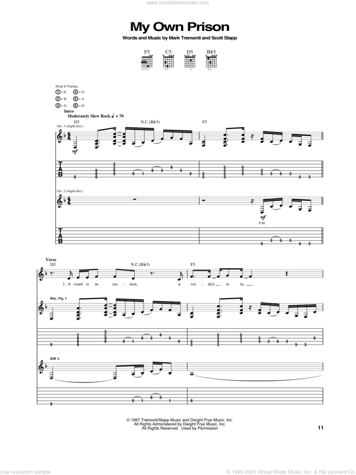 This new feature (still experimental) allows you to ask questions related to this music title to our AI music assistant (powered by OpenAI ChatGPT), trained to answer as an expert on this music title.You may ask questions like "When was this song written?" or "How would you suggest approaching this song?" You can also ask questions about the author or anything else you may think of. Just enter your queries inside the field on the top of the displayed music and click the "Ask" button on the left to start chatting. Remember that the assistant cannot perform catalog searches. It is focused only on this music title. It could also give you wrong or imperfect answers. In that case, click the "regenerate" button on the side of the answer to replace it with a new one. And, of course, you can provide feedback for each answer so we can improve the system. ![]() Creed: My Own Prison for guitar (tablature), intermediate sheet music. Includes an High-Quality PDF file to download instantly. Licensed to Virtual Sheet Music® by Hal Leonard® publishing company. NOTE: The image above is just a preview of the first page of this item. Buy this item to display, print, and enjoy the complete music. Basic Score Info
