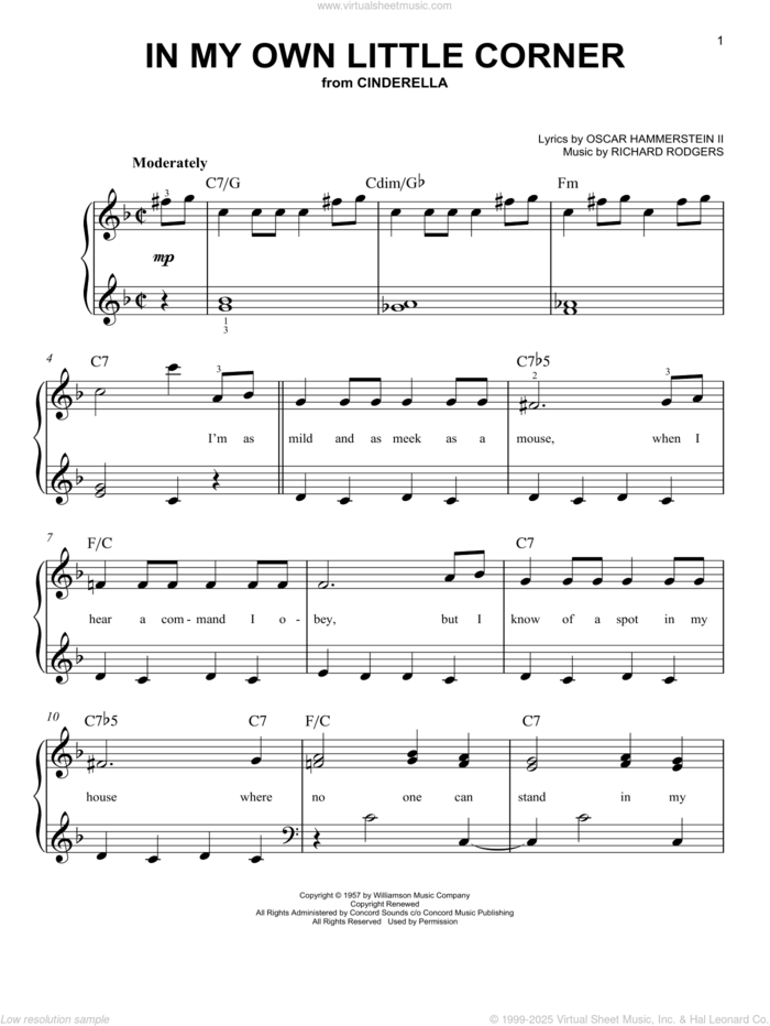 Rodgers & Hammerstein: In My Own Little Corner (from Cinderella the Musical) for piano solo, easy piano sheet music. High-Quality and Interactive, transposable in any key, play along. Includes an High-Quality PDF file to download instantly. Licensed to Virtual Sheet Music® by Hal Leonard® publishing company.