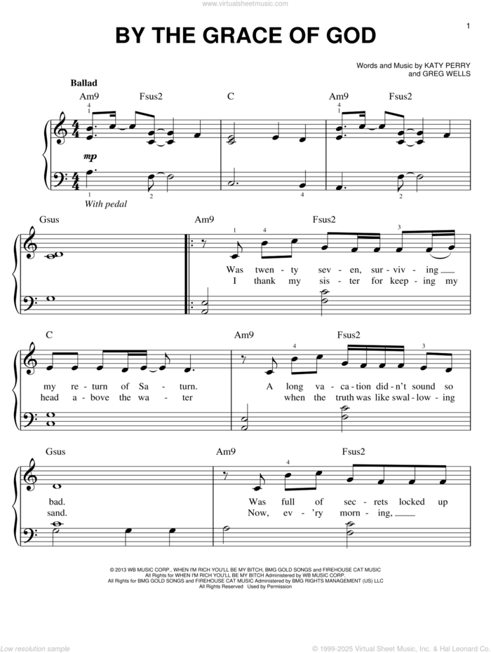 This new feature (still experimental) allows you to ask questions related to this music title to our AI music assistant (powered by OpenAI ChatGPT), trained to answer as an expert on this music title.You may ask questions like "When was this song written?" or "How would you suggest approaching this song?" You can also ask questions about the author or anything else you may think of. Just enter your queries inside the field on the top of the displayed music and click the "Ask" button on the left to start chatting. Remember that the assistant cannot perform catalog searches. It is focused only on this music title. It could also give you wrong or imperfect answers. In that case, click the "regenerate" button on the side of the answer to replace it with a new one. And, of course, you can provide feedback for each answer so we can improve the system. ![]() Katy Perry: By The Grace Of God for piano solo, easy piano sheet music. High-Quality and Interactive, transposable in any key, play along. Includes an High-Quality PDF file to download instantly. Licensed to Virtual Sheet Music® by Hal Leonard® publishing company. NOTE: The sample above is just the first page preview of this item. Buy this item to display, print, and play the complete music. Basic Score Info