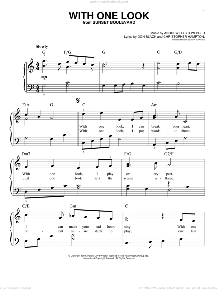 This new feature (still experimental) allows you to ask questions related to this music title to our AI music assistant (powered by OpenAI ChatGPT), trained to answer as an expert on this music title.You may ask questions like "When was this song written?" or "How would you suggest approaching this song?" You can also ask questions about the author or anything else you may think of. Just enter your queries inside the field on the top of the displayed music and click the "Ask" button on the left to start chatting. Remember that the assistant cannot perform catalog searches. It is focused only on this music title. It could also give you wrong or imperfect answers. In that case, click the "regenerate" button on the side of the answer to replace it with a new one. And, of course, you can provide feedback for each answer so we can improve the system. ![]() Andrew Lloyd Webber: With One Look, (easy) for piano solo, easy piano sheet music. High-Quality and Interactive, transposable in any key, play along. Includes an High-Quality PDF file to download instantly. Licensed to Virtual Sheet Music® by Hal Leonard® publishing company. NOTE: The sample above is just the first page preview of this item. Buy this item to display, print, and play the complete music. Basic Score Info