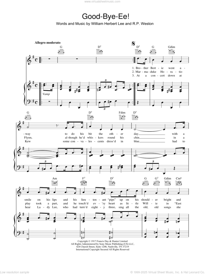 This new feature (still experimental) allows you to ask questions related to this music title to our AI music assistant (powered by OpenAI ChatGPT), trained to answer as an expert on this music title.You may ask questions like "When was this song written?" or "How would you suggest approaching this song?" You can also ask questions about the author or anything else you may think of. Just enter your queries inside the field on the top of the displayed music and click the "Ask" button on the left to start chatting. Remember that the assistant cannot perform catalog searches. It is focused only on this music title. It could also give you wrong or imperfect answers. In that case, click the "regenerate" button on the side of the answer to replace it with a new one. And, of course, you can provide feedback for each answer so we can improve the system. ![]() Dudley Moore: Goodbye-ee for voice, piano or guitar, intermediate sheet music. High-Quality and Interactive, transposable in any key, play along. Includes an High-Quality PDF file to download instantly. Licensed to Virtual Sheet Music® by Hal Leonard® publishing company. NOTE: The sample above is just the first page preview of this item. Buy this item to display, print, and play the complete music. Basic Score Info