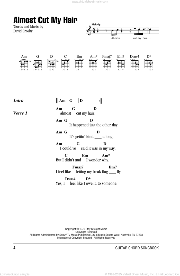 Crosby, Stills & Nash: Almost Cut My Hair for guitar (chords), intermediate sheet music. Includes an High-Quality PDF file to download instantly. Licensed to Virtual Sheet Music® by Hal Leonard® publishing company.