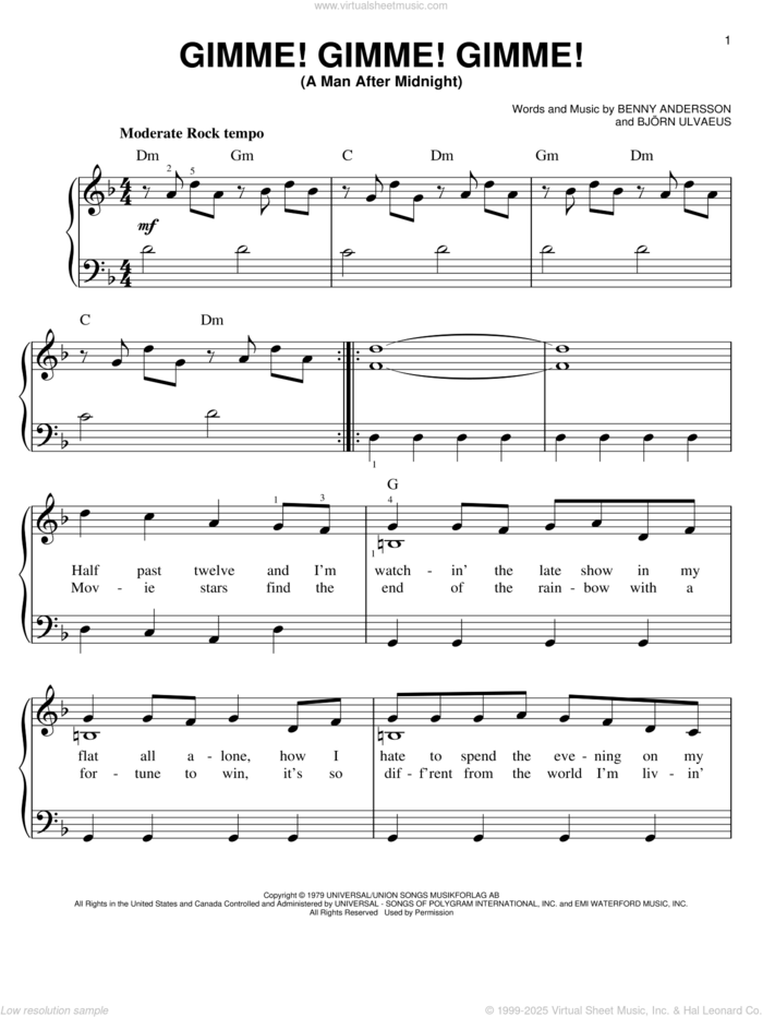 This new feature (still experimental) allows you to ask questions related to this music title to our AI music assistant (powered by OpenAI ChatGPT), trained to answer as an expert on this music title.You may ask questions like "When was this song written?" or "How would you suggest approaching this song?" You can also ask questions about the author or anything else you may think of. Just enter your queries inside the field on the top of the displayed music and click the "Ask" button on the left to start chatting. Remember that the assistant cannot perform catalog searches. It is focused only on this music title. It could also give you wrong or imperfect answers. In that case, click the "regenerate" button on the side of the answer to replace it with a new one. And, of course, you can provide feedback for each answer so we can improve the system. ![]() ABBA: Gimme! Gimme! Gimme! (A Man After Midnight), (easy) for piano solo, easy piano sheet music. High-Quality and Interactive, transposable in any key, play along. Includes an High-Quality PDF file to download instantly. Licensed to Virtual Sheet Music® by Hal Leonard® publishing company. NOTE: The sample above is just the first page preview of this item. Buy this item to display, print, and play the complete music. Basic Score Info