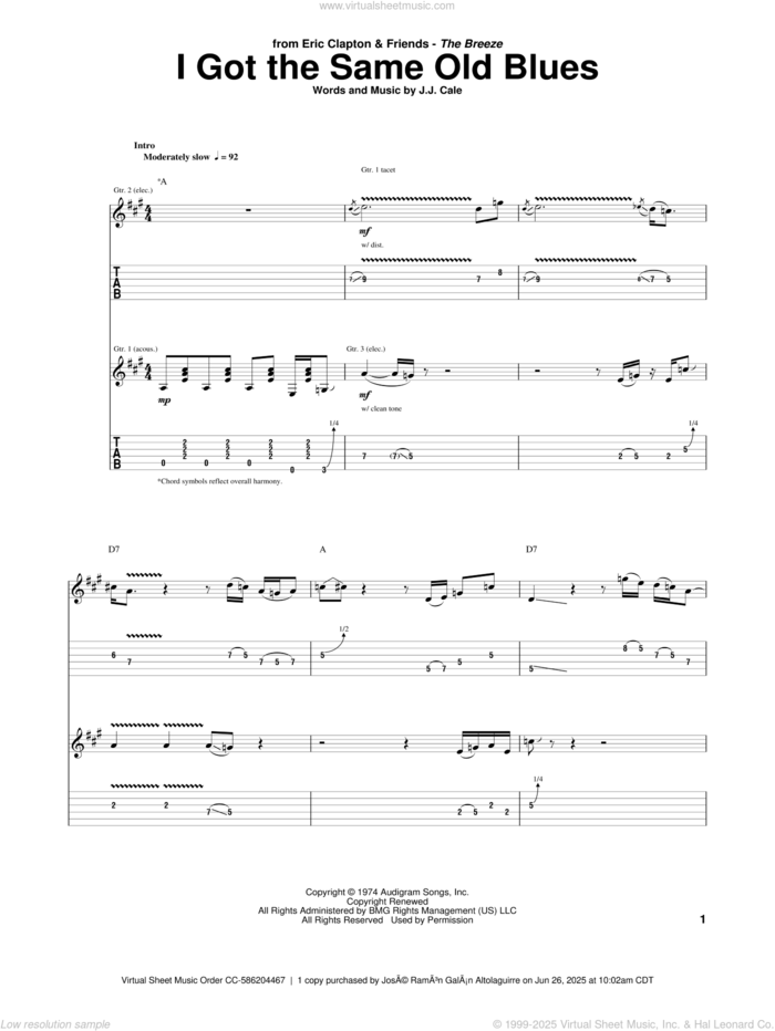 This new feature (still experimental) allows you to ask questions related to this music title to our AI music assistant (powered by OpenAI ChatGPT), trained to answer as an expert on this music title.You may ask questions like "When was this song written?" or "How would you suggest approaching this song?" You can also ask questions about the author or anything else you may think of. Just enter your queries inside the field on the top of the displayed music and click the "Ask" button on the left to start chatting. Remember that the assistant cannot perform catalog searches. It is focused only on this music title. It could also give you wrong or imperfect answers. In that case, click the "regenerate" button on the side of the answer to replace it with a new one. And, of course, you can provide feedback for each answer so we can improve the system. ![]() Eric Clapton: I Got The Same Old Blues for guitar (tablature), intermediate sheet music. Includes an High-Quality PDF file to download instantly. Licensed to Virtual Sheet Music® by Hal Leonard® publishing company. NOTE: The image above is just a preview of the first page of this item. Buy this item to display, print, and enjoy the complete music. Basic Score Info