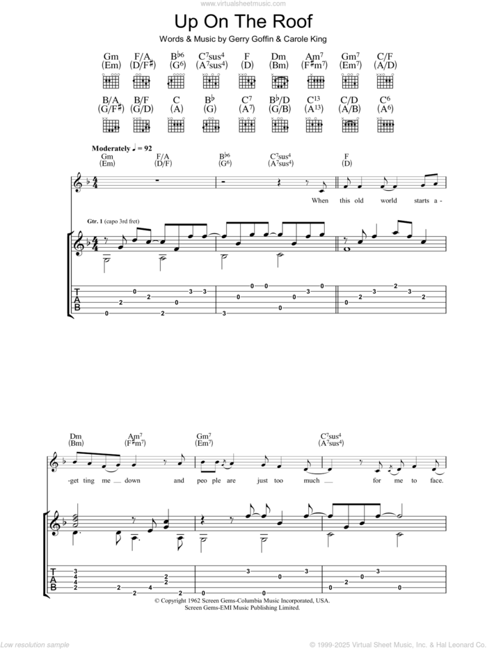 This new feature (still experimental) allows you to ask questions related to this music title to our AI music assistant (powered by OpenAI ChatGPT), trained to answer as an expert on this music title.You may ask questions like "When was this song written?" or "How would you suggest approaching this song?" You can also ask questions about the author or anything else you may think of. Just enter your queries inside the field on the top of the displayed music and click the "Ask" button on the left to start chatting. Remember that the assistant cannot perform catalog searches. It is focused only on this music title. It could also give you wrong or imperfect answers. In that case, click the "regenerate" button on the side of the answer to replace it with a new one. And, of course, you can provide feedback for each answer so we can improve the system. ![]() James Taylor: Up On The Roof for guitar (tablature), intermediate sheet music. Includes an High-Quality PDF file to download instantly. Licensed to Virtual Sheet Music® by Hal Leonard® publishing company. NOTE: The image above is just a preview of the first page of this item. Buy this item to display, print, and enjoy the complete music. Basic Score Info
