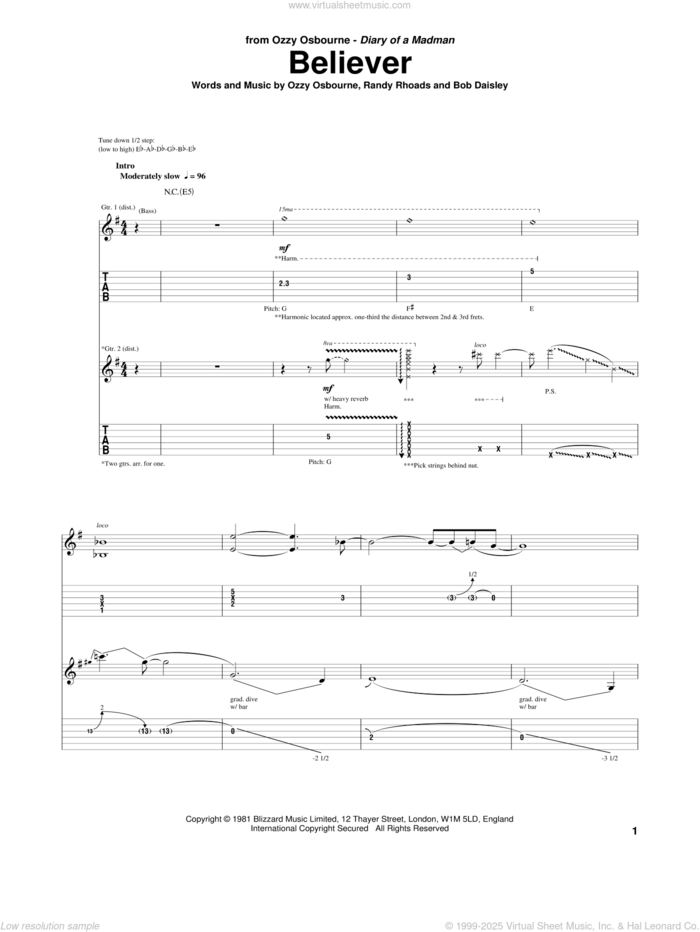 This new feature (still experimental) allows you to ask questions related to this music title to our AI music assistant (powered by OpenAI ChatGPT), trained to answer as an expert on this music title.You may ask questions like "When was this song written?" or "How would you suggest approaching this song?" You can also ask questions about the author or anything else you may think of. Just enter your queries inside the field on the top of the displayed music and click the "Ask" button on the left to start chatting. Remember that the assistant cannot perform catalog searches. It is focused only on this music title. It could also give you wrong or imperfect answers. In that case, click the "regenerate" button on the side of the answer to replace it with a new one. And, of course, you can provide feedback for each answer so we can improve the system. ![]() Ozzy Osbourne: Believer for guitar (tablature), intermediate sheet music. Includes an High-Quality PDF file to download instantly. Licensed to Virtual Sheet Music® by Hal Leonard® publishing company. NOTE: The image above is just a preview of the first page of this item. Buy this item to display, print, and enjoy the complete music. Basic Score Info