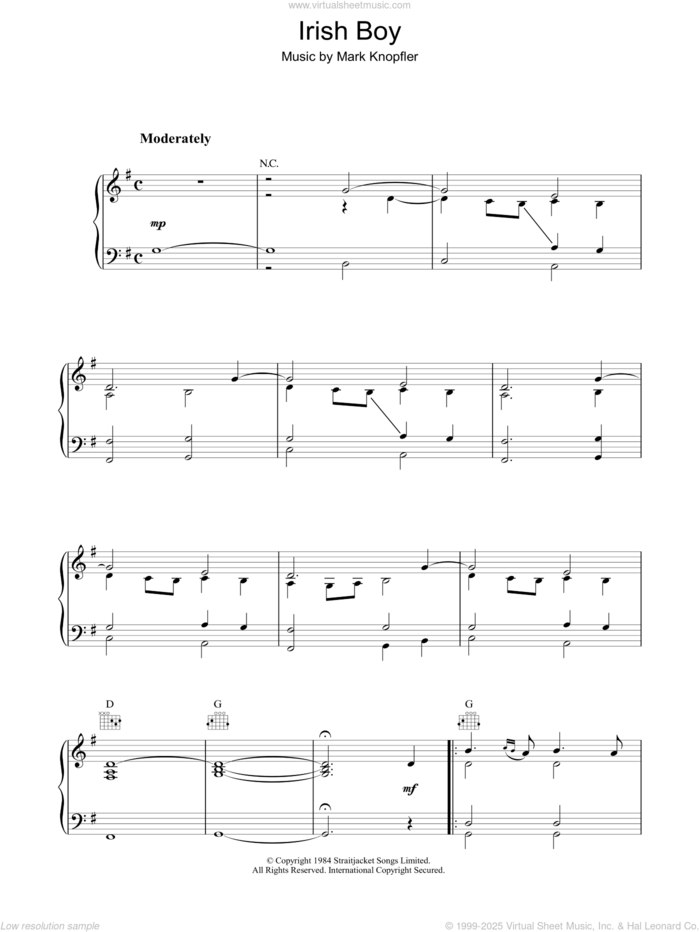 This new feature (still experimental) allows you to ask questions related to this music title to our AI music assistant (powered by OpenAI ChatGPT), trained to answer as an expert on this music title.You may ask questions like "When was this song written?" or "How would you suggest approaching this song?" You can also ask questions about the author or anything else you may think of. Just enter your queries inside the field on the top of the displayed music and click the "Ask" button on the left to start chatting. Remember that the assistant cannot perform catalog searches. It is focused only on this music title. It could also give you wrong or imperfect answers. In that case, click the "regenerate" button on the side of the answer to replace it with a new one. And, of course, you can provide feedback for each answer so we can improve the system. ![]() Mark Knopfler: Irish Boy (from Cal) for piano solo, intermediate piano sheet music. Includes an High-Quality PDF file to download instantly. Licensed to Virtual Sheet Music® by Hal Leonard® publishing company. NOTE: The image above is just a preview of the first page of this item. Buy this item to display, print, and enjoy the complete music. Basic Score Info