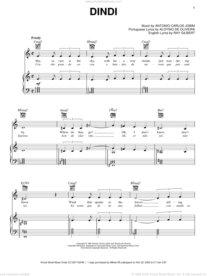 This new feature (still experimental) allows you to ask questions related to this music title to our AI music assistant (powered by OpenAI ChatGPT), trained to answer as an expert on this music title.You may ask questions like "When was this song written?" or "How would you suggest approaching this song?" You can also ask questions about the author or anything else you may think of. Just enter your queries inside the field on the top of the displayed music and click the "Ask" button on the left to start chatting. Remember that the assistant cannot perform catalog searches. It is focused only on this music title. It could also give you wrong or imperfect answers. In that case, click the "regenerate" button on the side of the answer to replace it with a new one. And, of course, you can provide feedback for each answer so we can improve the system. ![]() Antonio Carlos Jobim: Dindi for voice, piano or guitar, intermediate sheet music. High-Quality and Interactive, transposable in any key, play along. Includes an High-Quality PDF file to download instantly. Licensed to Virtual Sheet Music® by Hal Leonard® publishing company. NOTE: The sample above is just the first page preview of this item. Buy this item to display, print, and play the complete music. Basic Score Info