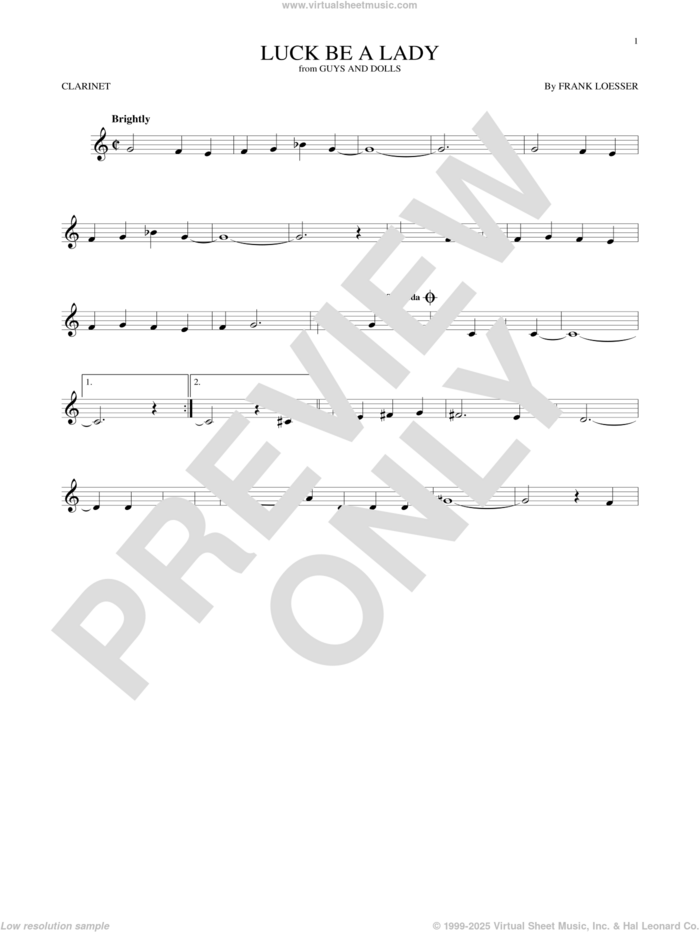 This new feature (still experimental) allows you to ask questions related to this music title to our AI music assistant (powered by OpenAI ChatGPT), trained to answer as an expert on this music title.You may ask questions like "When was this song written?" or "How would you suggest approaching this song?" You can also ask questions about the author or anything else you may think of. Just enter your queries inside the field on the top of the displayed music and click the "Ask" button on the left to start chatting. Remember that the assistant cannot perform catalog searches. It is focused only on this music title. It could also give you wrong or imperfect answers. In that case, click the "regenerate" button on the side of the answer to replace it with a new one. And, of course, you can provide feedback for each answer so we can improve the system. ![]() Frank Loesser: Luck Be A Lady for clarinet solo, intermediate clarinet sheet music. High-Quality and Interactive, transposable in any key, play along. Includes an High-Quality PDF file to download instantly. Licensed to Virtual Sheet Music® by Hal Leonard® publishing company. NOTE: The sample above is just the first page preview of this item. Buy this item to display, print, and play the complete music. Basic Score Info