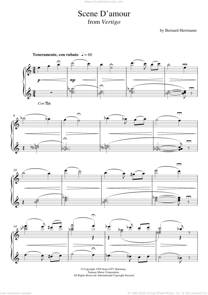 This new feature (still experimental) allows you to ask questions related to this music title to our AI music assistant (powered by OpenAI ChatGPT), trained to answer as an expert on this music title.You may ask questions like "When was this song written?" or "How would you suggest approaching this song?" You can also ask questions about the author or anything else you may think of. Just enter your queries inside the field on the top of the displayed music and click the "Ask" button on the left to start chatting. Remember that the assistant cannot perform catalog searches. It is focused only on this music title. It could also give you wrong or imperfect answers. In that case, click the "regenerate" button on the side of the answer to replace it with a new one. And, of course, you can provide feedback for each answer so we can improve the system. ![]() Bernard Herrmann: Scene D'amour From Vertigo for piano solo, intermediate piano sheet music. Includes an High-Quality PDF file to download instantly. Licensed to Virtual Sheet Music® by Hal Leonard® publishing company. NOTE: The image above is just a preview of the first page of this item. Buy this item to display, print, and enjoy the complete music. Basic Score Info