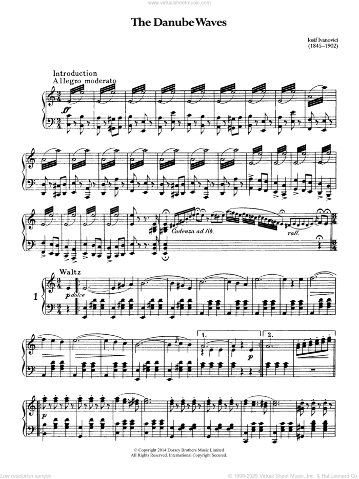 This new feature (still experimental) allows you to ask questions related to this music title to our AI music assistant (powered by OpenAI ChatGPT), trained to answer as an expert on this music title.You may ask questions like "When was this piece written?" or "How would you suggest approaching this piece?" You can also ask questions about the author or anything else you may think of. Just enter your queries inside the field on the top of the displayed music and click the "Ask" button on the left to start chatting. Remember that the assistant cannot perform catalog searches. It is focused only on this music title. It could also give you wrong or imperfect answers. In that case, click the "regenerate" button on the side of the answer to replace it with a new one. And, of course, you can provide feedback for each answer so we can improve the system. ![]() Iosif Ivanovici: Danube Waves for piano solo, intermediate piano sheet music. Includes an High-Quality PDF file to download instantly. Licensed to Virtual Sheet Music® by Hal Leonard® publishing company. NOTE: The image above is just a preview of the first page of this item. Buy this item to display, print, and enjoy the complete music. Basic Score Info