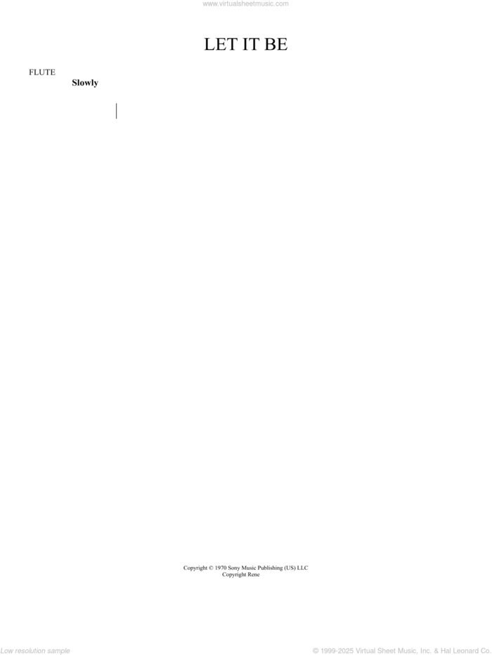 This new feature (still experimental) allows you to ask questions related to this music title to our AI music assistant (powered by OpenAI ChatGPT), trained to answer as an expert on this music title.You may ask questions like "When was this song written?" or "How would you suggest approaching this song?" You can also ask questions about the author or anything else you may think of. Just enter your queries inside the field on the top of the displayed music and click the "Ask" button on the left to start chatting. Remember that the assistant cannot perform catalog searches. It is focused only on this music title. It could also give you wrong or imperfect answers. In that case, click the "regenerate" button on the side of the answer to replace it with a new one. And, of course, you can provide feedback for each answer so we can improve the system. ![]() The Beatles: Let It Be for flute solo, intermediate flute sheet music. High-Quality and Interactive, transposable in any key, play along. Includes an High-Quality PDF file to download instantly. Licensed to Virtual Sheet Music® by Hal Leonard® publishing company. NOTE: The sample above is just the first page preview of this item. Buy this item to display, print, and play the complete music. Basic Score Info