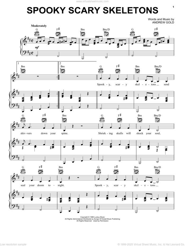 This new feature (still experimental) allows you to ask questions related to this music title to our AI music assistant (powered by OpenAI ChatGPT), trained to answer as an expert on this music title.You may ask questions like "When was this song written?" or "How would you suggest approaching this song?" You can also ask questions about the author or anything else you may think of. Just enter your queries inside the field on the top of the displayed music and click the "Ask" button on the left to start chatting. Remember that the assistant cannot perform catalog searches. It is focused only on this music title. It could also give you wrong or imperfect answers. In that case, click the "regenerate" button on the side of the answer to replace it with a new one. And, of course, you can provide feedback for each answer so we can improve the system. ![]() Andrew Gold: Spooky Scary Skeletons for voice, piano or guitar, intermediate sheet music. High-Quality and Interactive, transposable in any key, play along. Includes an High-Quality PDF file to download instantly. Licensed to Virtual Sheet Music® by Hal Leonard® publishing company. NOTE: The sample above is just the first page preview of this item. Buy this item to display, print, and play the complete music. Basic Score Info