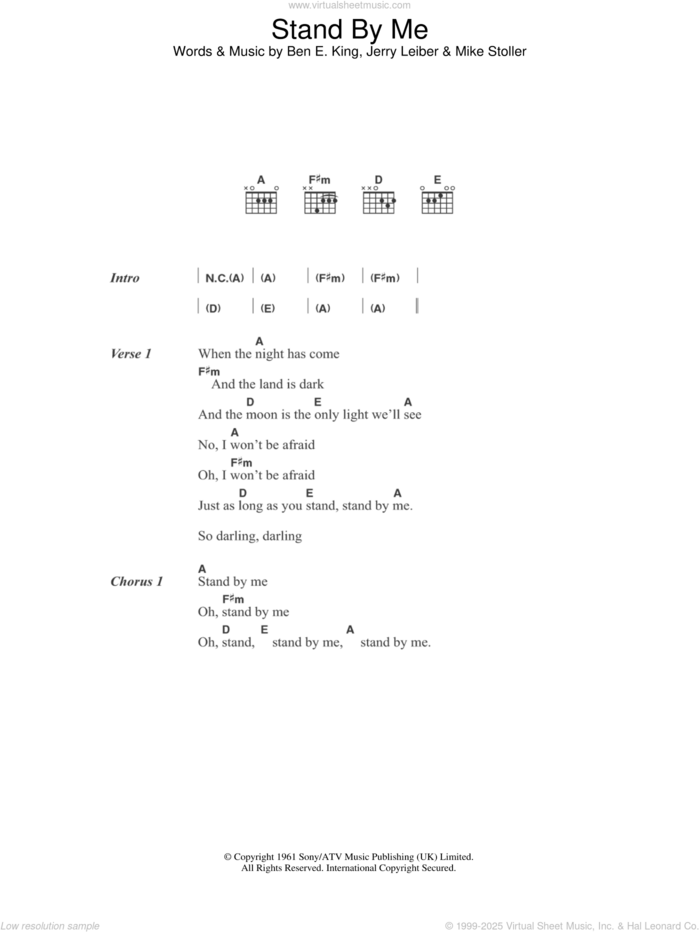 This new feature (still experimental) allows you to ask questions related to this music title to our AI music assistant (powered by OpenAI ChatGPT), trained to answer as an expert on this music title.You may ask questions like "When was this song written?" or "How would you suggest approaching this song?" You can also ask questions about the author or anything else you may think of. Just enter your queries inside the field on the top of the displayed music and click the "Ask" button on the left to start chatting. Remember that the assistant cannot perform catalog searches. It is focused only on this music title. It could also give you wrong or imperfect answers. In that case, click the "regenerate" button on the side of the answer to replace it with a new one. And, of course, you can provide feedback for each answer so we can improve the system. ![]() Ben E. King: Stand By Me for guitar (chords), intermediate sheet music. Includes an High-Quality PDF file to download instantly. Licensed to Virtual Sheet Music® by Hal Leonard® publishing company. NOTE: The image above is just a preview of the first page of this item. Buy this item to display, print, and enjoy the complete music. Basic Score Info