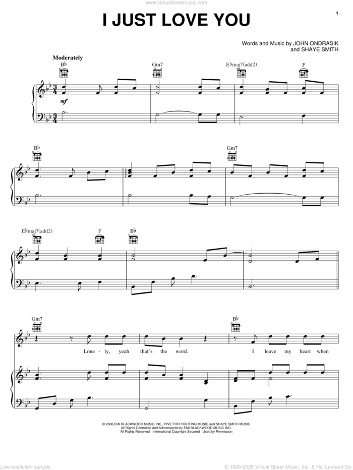 This new feature (still experimental) allows you to ask questions related to this music title to our AI music assistant (powered by OpenAI ChatGPT), trained to answer as an expert on this music title.You may ask questions like "When was this song written?" or "How would you suggest approaching this song?" You can also ask questions about the author or anything else you may think of. Just enter your queries inside the field on the top of the displayed music and click the "Ask" button on the left to start chatting. Remember that the assistant cannot perform catalog searches. It is focused only on this music title. It could also give you wrong or imperfect answers. In that case, click the "regenerate" button on the side of the answer to replace it with a new one. And, of course, you can provide feedback for each answer so we can improve the system. ![]() Five For Fighting: I Just Love You for voice, piano or guitar, intermediate sheet music. High-Quality and Interactive, transposable in any key, play along. Includes an High-Quality PDF file to download instantly. Licensed to Virtual Sheet Music® by Hal Leonard® publishing company. NOTE: The sample above is just the first page preview of this item. Buy this item to display, print, and play the complete music. Basic Score Info