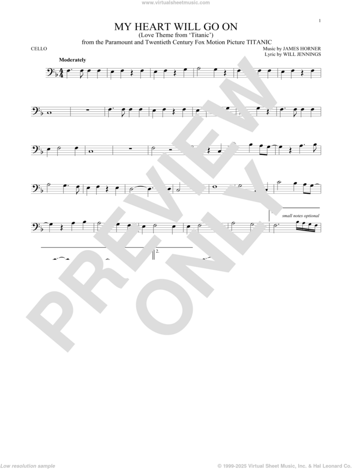 This new feature (still experimental) allows you to ask questions related to this music title to our AI music assistant (powered by OpenAI ChatGPT), trained to answer as an expert on this music title.You may ask questions like "When was this song written?" or "How would you suggest approaching this song?" You can also ask questions about the author or anything else you may think of. Just enter your queries inside the field on the top of the displayed music and click the "Ask" button on the left to start chatting. Remember that the assistant cannot perform catalog searches. It is focused only on this music title. It could also give you wrong or imperfect answers. In that case, click the "regenerate" button on the side of the answer to replace it with a new one. And, of course, you can provide feedback for each answer so we can improve the system. ![]() Celine Dion: My Heart Will Go On (Love Theme From Titanic) for cello solo, intermediate cello sheet music. High-Quality and Interactive, transposable in any key, play along. Includes an High-Quality PDF file to download instantly. Licensed to Virtual Sheet Music® by Hal Leonard® publishing company. NOTE: The sample above is just the first page preview of this item. Buy this item to display, print, and play the complete music. Basic Score Info