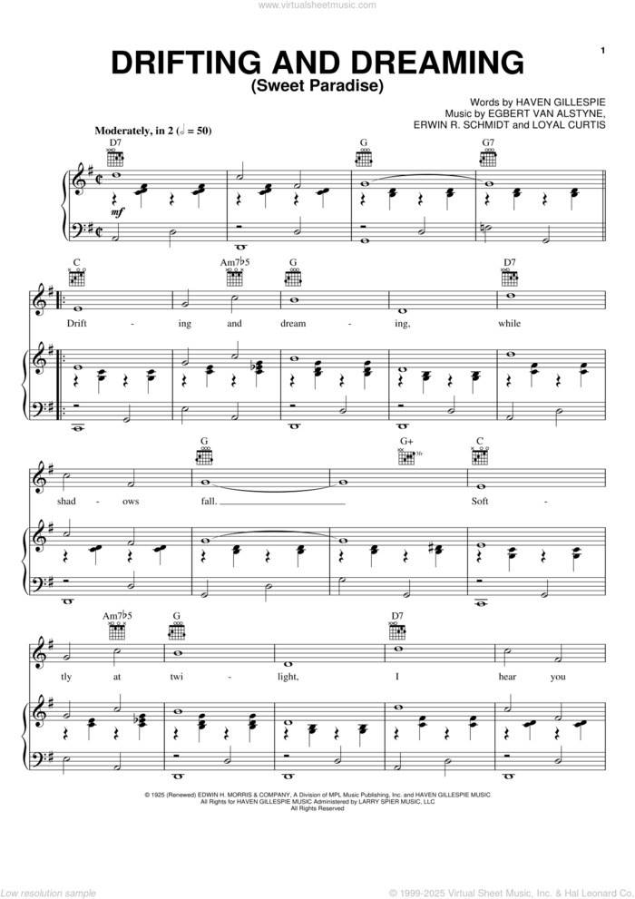 This new feature (still experimental) allows you to ask questions related to this music title to our AI music assistant (powered by OpenAI ChatGPT), trained to answer as an expert on this music title.You may ask questions like "When was this song written?" or "How would you suggest approaching this song?" You can also ask questions about the author or anything else you may think of. Just enter your queries inside the field on the top of the displayed music and click the "Ask" button on the left to start chatting. Remember that the assistant cannot perform catalog searches. It is focused only on this music title. It could also give you wrong or imperfect answers. In that case, click the "regenerate" button on the side of the answer to replace it with a new one. And, of course, you can provide feedback for each answer so we can improve the system. ![]() Egbert Van Alstyne: Drifting And Dreaming (Sweet Paradise) for voice, piano or guitar, intermediate sheet music. High-Quality and Interactive, transposable in any key, play along. Includes an High-Quality PDF file to download instantly. Licensed to Virtual Sheet Music® by Hal Leonard® publishing company. NOTE: The sample above is just the first page preview of this item. Buy this item to display, print, and play the complete music. Basic Score Info