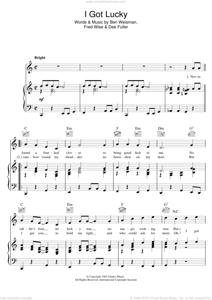This new feature (still experimental) allows you to ask questions related to this music title to our AI music assistant (powered by OpenAI ChatGPT), trained to answer as an expert on this music title.You may ask questions like "When was this song written?" or "How would you suggest approaching this song?" You can also ask questions about the author or anything else you may think of. Just enter your queries inside the field on the top of the displayed music and click the "Ask" button on the left to start chatting. Remember that the assistant cannot perform catalog searches. It is focused only on this music title. It could also give you wrong or imperfect answers. In that case, click the "regenerate" button on the side of the answer to replace it with a new one. And, of course, you can provide feedback for each answer so we can improve the system. ![]() Elvis Presley: I Got Lucky for voice, piano or guitar, intermediate sheet music. High-Quality and Interactive, transposable in any key, play along. Includes an High-Quality PDF file to download instantly. Licensed to Virtual Sheet Music® by Hal Leonard® publishing company. NOTE: The sample above is just the first page preview of this item. Buy this item to display, print, and play the complete music. Basic Score Info