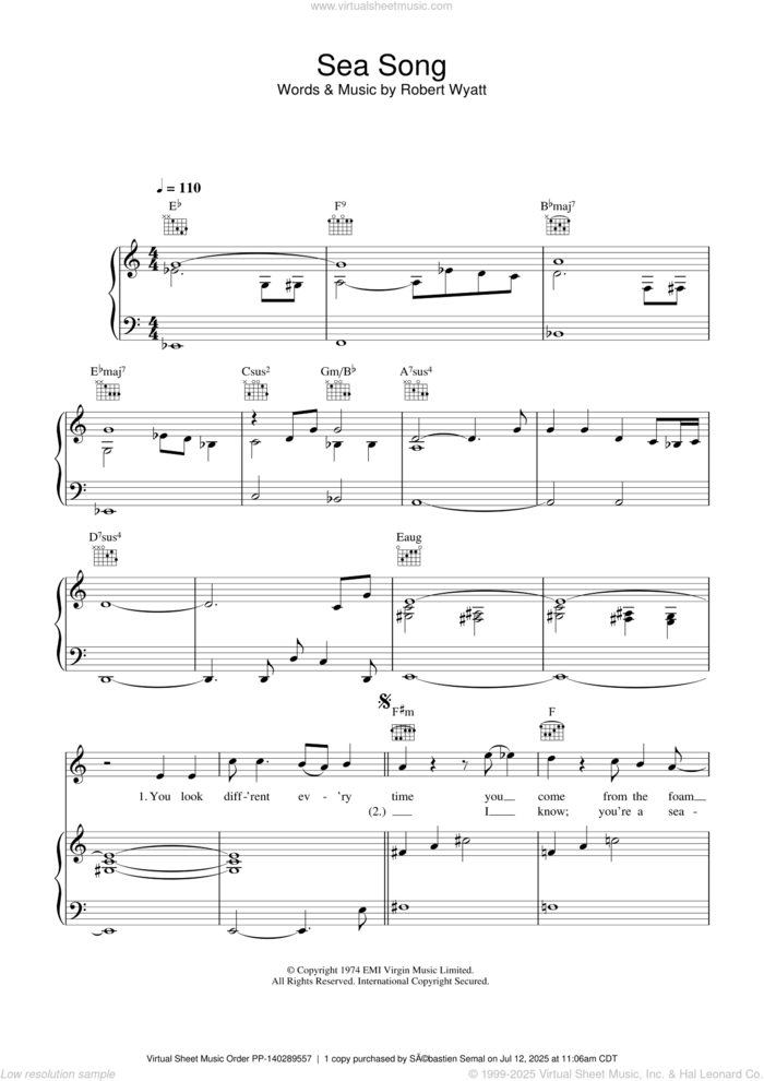 This new feature (still experimental) allows you to ask questions related to this music title to our AI music assistant (powered by OpenAI ChatGPT), trained to answer as an expert on this music title.You may ask questions like "When was this song written?" or "How would you suggest approaching this song?" You can also ask questions about the author or anything else you may think of. Just enter your queries inside the field on the top of the displayed music and click the "Ask" button on the left to start chatting. Remember that the assistant cannot perform catalog searches. It is focused only on this music title. It could also give you wrong or imperfect answers. In that case, click the "regenerate" button on the side of the answer to replace it with a new one. And, of course, you can provide feedback for each answer so we can improve the system. ![]() Robert Wyatt: Sea Song for voice, piano or guitar, intermediate sheet music. Includes an High-Quality PDF file to download instantly. Licensed to Virtual Sheet Music® by Hal Leonard® publishing company. NOTE: The image above is just a preview of the first page of this item. Buy this item to display, print, and enjoy the complete music. Basic Score Info