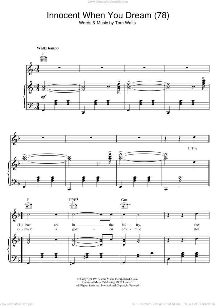 This new feature (still experimental) allows you to ask questions related to this music title to our AI music assistant (powered by OpenAI ChatGPT), trained to answer as an expert on this music title.You may ask questions like "When was this song written?" or "How would you suggest approaching this song?" You can also ask questions about the author or anything else you may think of. Just enter your queries inside the field on the top of the displayed music and click the "Ask" button on the left to start chatting. Remember that the assistant cannot perform catalog searches. It is focused only on this music title. It could also give you wrong or imperfect answers. In that case, click the "regenerate" button on the side of the answer to replace it with a new one. And, of course, you can provide feedback for each answer so we can improve the system. ![]() Tom Waits: Innocent When You Dream (78) for voice, piano or guitar, intermediate sheet music. Includes an High-Quality PDF file to download instantly. Licensed to Virtual Sheet Music® by Hal Leonard® publishing company. NOTE: The image above is just a preview of the first page of this item. Buy this item to display, print, and enjoy the complete music. Basic Score Info