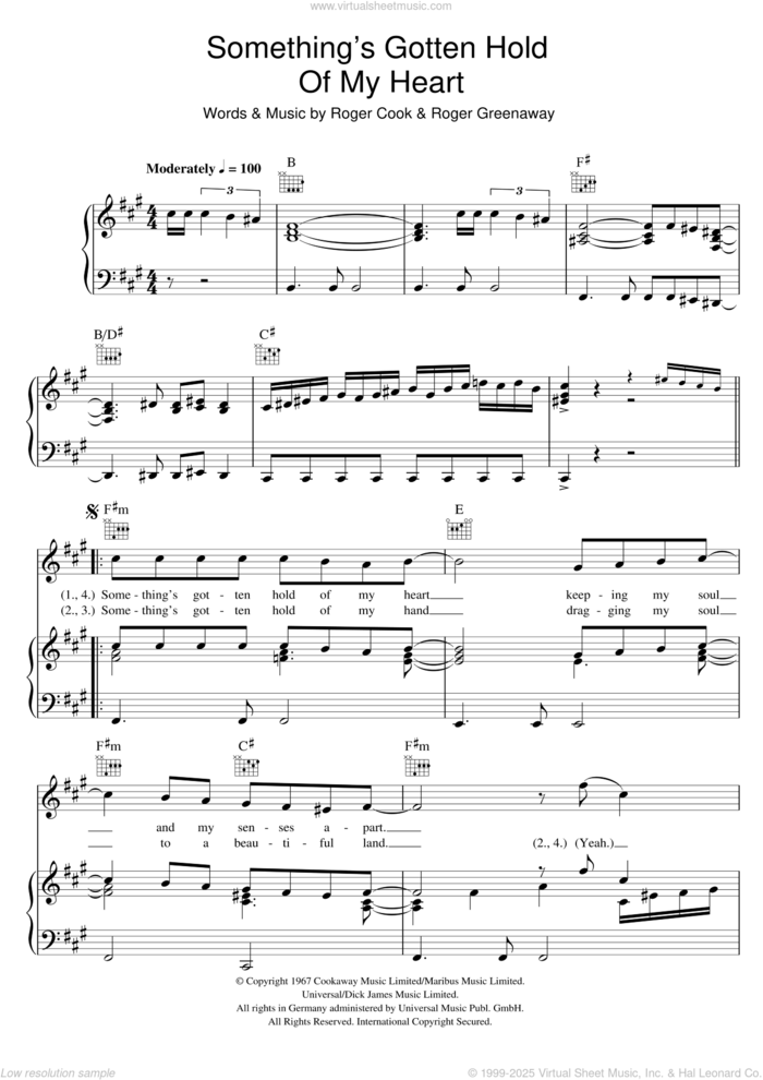 This new feature (still experimental) allows you to ask questions related to this music title to our AI music assistant (powered by OpenAI ChatGPT), trained to answer as an expert on this music title.You may ask questions like "When was this song written?" or "How would you suggest approaching this song?" You can also ask questions about the author or anything else you may think of. Just enter your queries inside the field on the top of the displayed music and click the "Ask" button on the left to start chatting. Remember that the assistant cannot perform catalog searches. It is focused only on this music title. It could also give you wrong or imperfect answers. In that case, click the "regenerate" button on the side of the answer to replace it with a new one. And, of course, you can provide feedback for each answer so we can improve the system. ![]() Gene Pitney: Something's Gotten Hold Of My Heart for voice, piano or guitar, intermediate sheet music. Includes an High-Quality PDF file to download instantly. Licensed to Virtual Sheet Music® by Hal Leonard® publishing company. NOTE: The image above is just a preview of the first page of this item. Buy this item to display, print, and enjoy the complete music. Basic Score Info