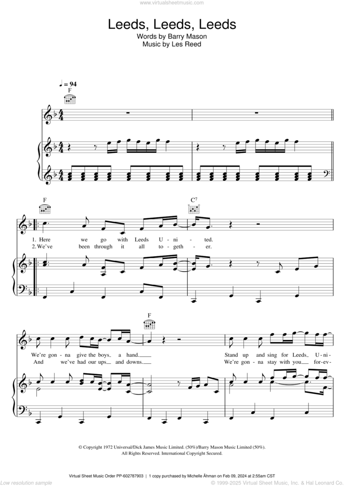 This new feature (still experimental) allows you to ask questions related to this music title to our AI music assistant (powered by OpenAI ChatGPT), trained to answer as an expert on this music title.You may ask questions like "When was this song written?" or "How would you suggest approaching this song?" You can also ask questions about the author or anything else you may think of. Just enter your queries inside the field on the top of the displayed music and click the "Ask" button on the left to start chatting. Remember that the assistant cannot perform catalog searches. It is focused only on this music title. It could also give you wrong or imperfect answers. In that case, click the "regenerate" button on the side of the answer to replace it with a new one. And, of course, you can provide feedback for each answer so we can improve the system. ![]() Leeds United Team & Supporters: Leeds, Leeds, Leeds (Marching On Together) for voice, piano or guitar, intermediate sheet music. Includes an High-Quality PDF file to download instantly. Licensed to Virtual Sheet Music® by Hal Leonard® publishing company. NOTE: The image above is just a preview of the first page of this item. Buy this item to display, print, and enjoy the complete music. Basic Score Info
