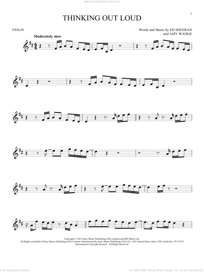 This new feature (still experimental) allows you to ask questions related to this music title to our AI music assistant (powered by OpenAI ChatGPT), trained to answer as an expert on this music title.You may ask questions like "When was this song written?" or "How would you suggest approaching this song?" You can also ask questions about the author or anything else you may think of. Just enter your queries inside the field on the top of the displayed music and click the "Ask" button on the left to start chatting. Remember that the assistant cannot perform catalog searches. It is focused only on this music title. It could also give you wrong or imperfect answers. In that case, click the "regenerate" button on the side of the answer to replace it with a new one. And, of course, you can provide feedback for each answer so we can improve the system. ![]() Ed Sheeran: Thinking Out Loud for violin solo, intermediate violin sheet music. High-Quality and Interactive, transposable in any key, play along. Includes an High-Quality PDF file to download instantly. Licensed to Virtual Sheet Music® by Hal Leonard® publishing company. NOTE: The sample above is just the first page preview of this item. Buy this item to display, print, and play the complete music. Basic Score Info
