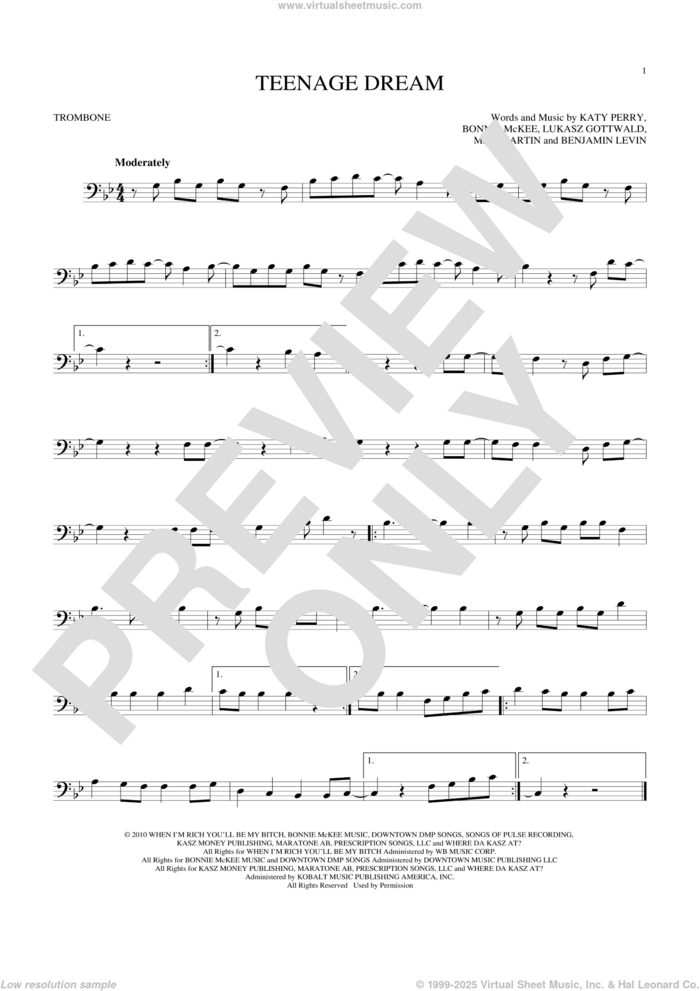 This new feature (still experimental) allows you to ask questions related to this music title to our AI music assistant (powered by OpenAI ChatGPT), trained to answer as an expert on this music title.You may ask questions like "When was this song written?" or "How would you suggest approaching this song?" You can also ask questions about the author or anything else you may think of. Just enter your queries inside the field on the top of the displayed music and click the "Ask" button on the left to start chatting. Remember that the assistant cannot perform catalog searches. It is focused only on this music title. It could also give you wrong or imperfect answers. In that case, click the "regenerate" button on the side of the answer to replace it with a new one. And, of course, you can provide feedback for each answer so we can improve the system. ![]() Katy Perry: Teenage Dream for trombone solo, intermediate trombone sheet music. High-Quality and Interactive, transposable in any key, play along. Includes an High-Quality PDF file to download instantly. Licensed to Virtual Sheet Music® by Hal Leonard® publishing company. NOTE: The sample above is just the first page preview of this item. Buy this item to display, print, and play the complete music. Basic Score Info