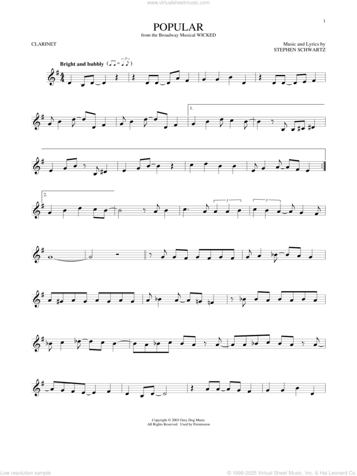 This new feature (still experimental) allows you to ask questions related to this music title to our AI music assistant (powered by OpenAI ChatGPT), trained to answer as an expert on this music title.You may ask questions like "When was this song written?" or "How would you suggest approaching this song?" You can also ask questions about the author or anything else you may think of. Just enter your queries inside the field on the top of the displayed music and click the "Ask" button on the left to start chatting. Remember that the assistant cannot perform catalog searches. It is focused only on this music title. It could also give you wrong or imperfect answers. In that case, click the "regenerate" button on the side of the answer to replace it with a new one. And, of course, you can provide feedback for each answer so we can improve the system. ![]() Stephen Schwartz: Popular (from Wicked) for clarinet solo, intermediate clarinet sheet music. High-Quality and Interactive, transposable in any key, play along. Includes an High-Quality PDF file to download instantly. Licensed to Virtual Sheet Music® by Hal Leonard® publishing company. NOTE: The sample above is just the first page preview of this item. Buy this item to display, print, and play the complete music. Basic Score Info