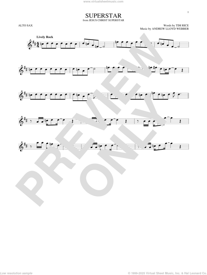 This new feature (still experimental) allows you to ask questions related to this music title to our AI music assistant (powered by OpenAI ChatGPT), trained to answer as an expert on this music title.You may ask questions like "When was this song written?" or "How would you suggest approaching this song?" You can also ask questions about the author or anything else you may think of. Just enter your queries inside the field on the top of the displayed music and click the "Ask" button on the left to start chatting. Remember that the assistant cannot perform catalog searches. It is focused only on this music title. It could also give you wrong or imperfect answers. In that case, click the "regenerate" button on the side of the answer to replace it with a new one. And, of course, you can provide feedback for each answer so we can improve the system. ![]() Andrew Lloyd Webber: Superstar (from Jesus Christ Superstar) for alto saxophone solo, intermediate alto sax sheet music. High-Quality and Interactive, transposable in any key, play along. Includes an High-Quality PDF file to download instantly. Licensed to Virtual Sheet Music® by Hal Leonard® publishing company. NOTE: The sample above is just the first page preview of this item. Buy this item to display, print, and play the complete music. Basic Score Info