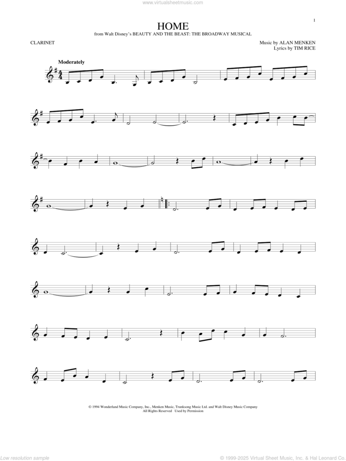 This new feature (still experimental) allows you to ask questions related to this music title to our AI music assistant (powered by OpenAI ChatGPT), trained to answer as an expert on this music title.You may ask questions like "When was this song written?" or "How would you suggest approaching this song?" You can also ask questions about the author or anything else you may think of. Just enter your queries inside the field on the top of the displayed music and click the "Ask" button on the left to start chatting. Remember that the assistant cannot perform catalog searches. It is focused only on this music title. It could also give you wrong or imperfect answers. In that case, click the "regenerate" button on the side of the answer to replace it with a new one. And, of course, you can provide feedback for each answer so we can improve the system. ![]() Alan Menken: Home (from Beauty and the Beast: The Broadway Musical) for clarinet solo, intermediate clarinet sheet music. High-Quality and Interactive, transposable in any key, play along. Includes an High-Quality PDF file to download instantly. Licensed to Virtual Sheet Music® by Hal Leonard® publishing company. NOTE: The sample above is just the first page preview of this item. Buy this item to display, print, and play the complete music. Basic Score Info