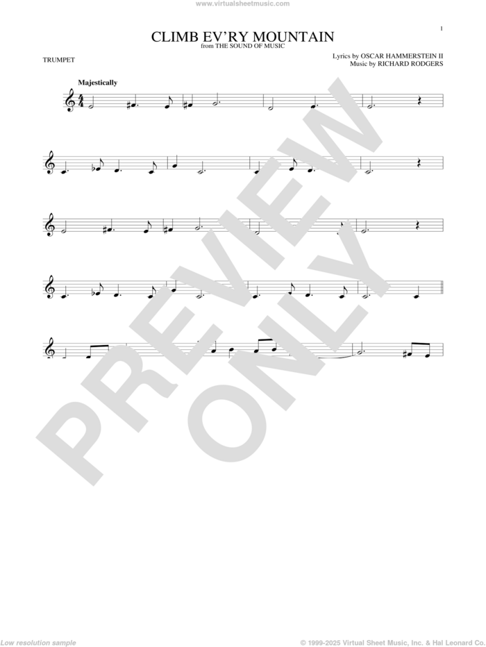 This new feature (still experimental) allows you to ask questions related to this music title to our AI music assistant (powered by OpenAI ChatGPT), trained to answer as an expert on this music title.You may ask questions like "When was this song written?" or "How would you suggest approaching this song?" You can also ask questions about the author or anything else you may think of. Just enter your queries inside the field on the top of the displayed music and click the "Ask" button on the left to start chatting. Remember that the assistant cannot perform catalog searches. It is focused only on this music title. It could also give you wrong or imperfect answers. In that case, click the "regenerate" button on the side of the answer to replace it with a new one. And, of course, you can provide feedback for each answer so we can improve the system. ![]() Rodgers & Hammerstein: Climb Ev'ry Mountain for trumpet solo, intermediate trumpet sheet music. High-Quality and Interactive, transposable in any key, play along. Includes an High-Quality PDF file to download instantly. Licensed to Virtual Sheet Music® by Hal Leonard® publishing company. NOTE: The sample above is just the first page preview of this item. Buy this item to display, print, and play the complete music. Basic Score Info