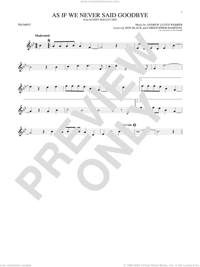 This new feature (still experimental) allows you to ask questions related to this music title to our AI music assistant (powered by OpenAI ChatGPT), trained to answer as an expert on this music title.You may ask questions like "When was this song written?" or "How would you suggest approaching this song?" You can also ask questions about the author or anything else you may think of. Just enter your queries inside the field on the top of the displayed music and click the "Ask" button on the left to start chatting. Remember that the assistant cannot perform catalog searches. It is focused only on this music title. It could also give you wrong or imperfect answers. In that case, click the "regenerate" button on the side of the answer to replace it with a new one. And, of course, you can provide feedback for each answer so we can improve the system. ![]() Andrew Lloyd Webber: As If We Never Said Goodbye (from Sunset Boulevard) for trumpet solo, intermediate trumpet sheet music. High-Quality and Interactive, transposable in any key, play along. Includes an High-Quality PDF file to download instantly. Licensed to Virtual Sheet Music® by Hal Leonard® publishing company. NOTE: The sample above is just the first page preview of this item. Buy this item to display, print, and play the complete music. Basic Score Info