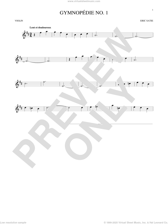 This new feature (still experimental) allows you to ask questions related to this music title to our AI music assistant (powered by OpenAI ChatGPT), trained to answer as an expert on this music title.You may ask questions like "When was this piece written?" or "How would you suggest approaching this piece?" You can also ask questions about the author or anything else you may think of. Just enter your queries inside the field on the top of the displayed music and click the "Ask" button on the left to start chatting. Remember that the assistant cannot perform catalog searches. It is focused only on this music title. It could also give you wrong or imperfect answers. In that case, click the "regenerate" button on the side of the answer to replace it with a new one. And, of course, you can provide feedback for each answer so we can improve the system. ![]() Erik Satie: Gymnopedie No. 1 for violin solo, intermediate violin sheet music. High-Quality and Interactive, transposable in any key, play along. Includes an High-Quality PDF file to download instantly. Licensed to Virtual Sheet Music® by Hal Leonard® publishing company. NOTE: The sample above is just the first page preview of this item. Buy this item to display, print, and play the complete music. Basic Score Info