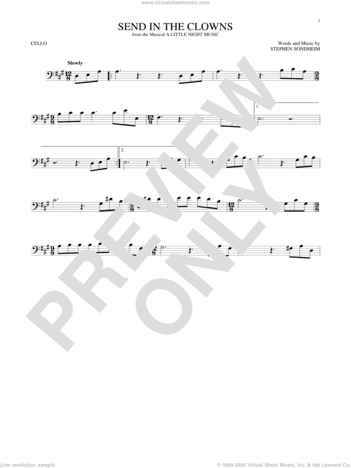 This new feature (still experimental) allows you to ask questions related to this music title to our AI music assistant (powered by OpenAI ChatGPT), trained to answer as an expert on this music title.You may ask questions like "When was this song written?" or "How would you suggest approaching this song?" You can also ask questions about the author or anything else you may think of. Just enter your queries inside the field on the top of the displayed music and click the "Ask" button on the left to start chatting. Remember that the assistant cannot perform catalog searches. It is focused only on this music title. It could also give you wrong or imperfect answers. In that case, click the "regenerate" button on the side of the answer to replace it with a new one. And, of course, you can provide feedback for each answer so we can improve the system. ![]() Stephen Sondheim: Send In The Clowns for cello solo, intermediate cello sheet music. High-Quality and Interactive, transposable in any key, play along. Includes an High-Quality PDF file to download instantly. Licensed to Virtual Sheet Music® by Hal Leonard® publishing company. NOTE: The sample above is just the first page preview of this item. Buy this item to display, print, and play the complete music. Basic Score Info