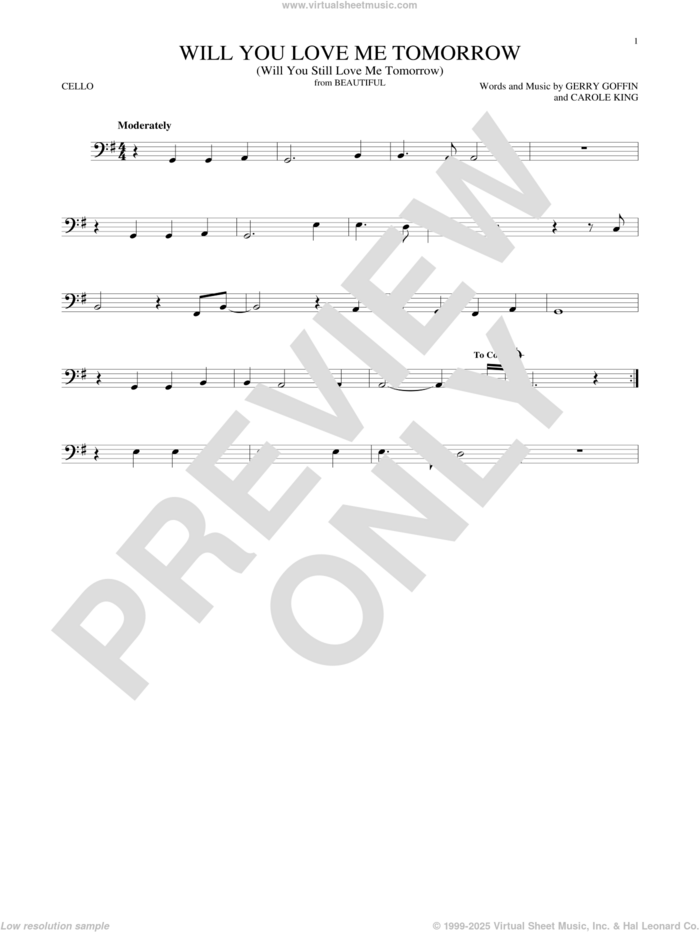 This new feature (still experimental) allows you to ask questions related to this music title to our AI music assistant (powered by OpenAI ChatGPT), trained to answer as an expert on this music title.You may ask questions like "When was this song written?" or "How would you suggest approaching this song?" You can also ask questions about the author or anything else you may think of. Just enter your queries inside the field on the top of the displayed music and click the "Ask" button on the left to start chatting. Remember that the assistant cannot perform catalog searches. It is focused only on this music title. It could also give you wrong or imperfect answers. In that case, click the "regenerate" button on the side of the answer to replace it with a new one. And, of course, you can provide feedback for each answer so we can improve the system. ![]() The Shirelles: Will You Love Me Tomorrow (Will You Still Love Me Tomorrow) for cello solo, intermediate cello sheet music. High-Quality and Interactive, transposable in any key, play along. Includes an High-Quality PDF file to download instantly. Licensed to Virtual Sheet Music® by Hal Leonard® publishing company. NOTE: The sample above is just the first page preview of this item. Buy this item to display, print, and play the complete music. Basic Score Info