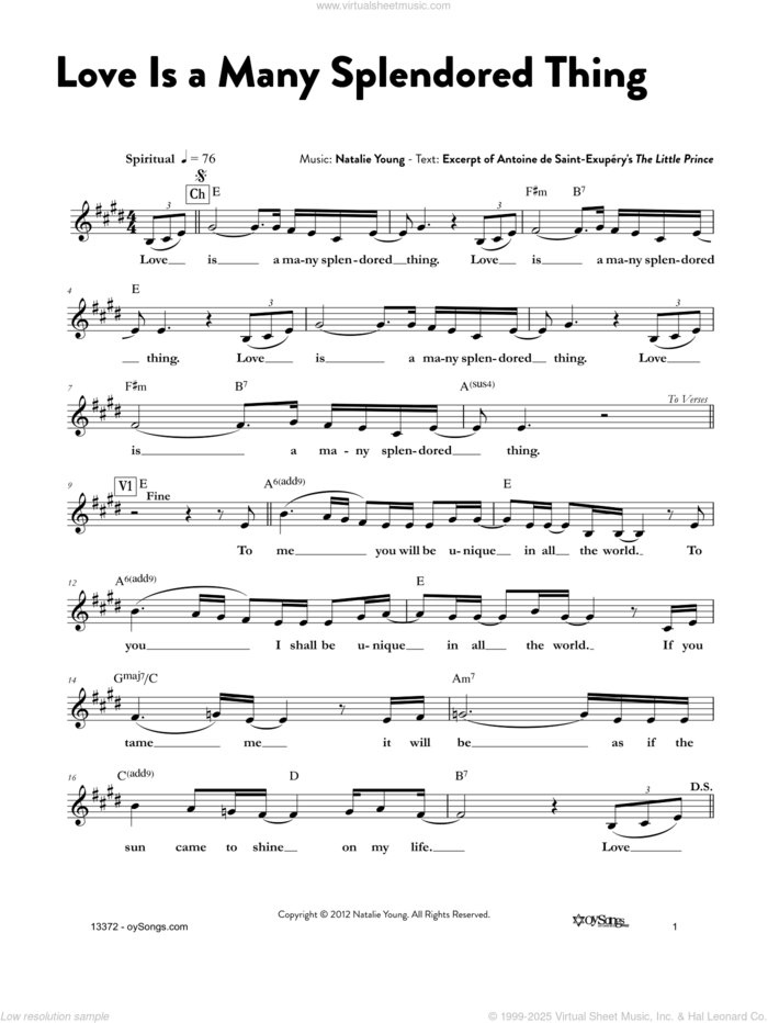 This new feature (still experimental) allows you to ask questions related to this music title to our AI music assistant (powered by OpenAI ChatGPT), trained to answer as an expert on this music title.You may ask questions like "When was this song written?" or "How would you suggest approaching this song?" You can also ask questions about the author or anything else you may think of. Just enter your queries inside the field on the top of the displayed music and click the "Ask" button on the left to start chatting. Remember that the assistant cannot perform catalog searches. It is focused only on this music title. It could also give you wrong or imperfect answers. In that case, click the "regenerate" button on the side of the answer to replace it with a new one. And, of course, you can provide feedback for each answer so we can improve the system. ![]() Natalie Young: Love Is a Many Splendored Thing for voice and other instruments (fake book), intermediate voice sheet music. Includes an High-Quality PDF file to download instantly. Licensed to Virtual Sheet Music® by Hal Leonard® publishing company. NOTE: The image above is just a preview of the first page of this item. Buy this item to display, print, and enjoy the complete music. Basic Score Info