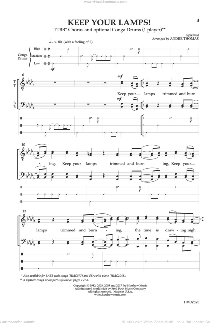 This new feature (still experimental) allows you to ask questions related to this music title to our AI music assistant (powered by OpenAI ChatGPT), trained to answer as an expert on this music title.You may ask questions like "When was this song written?" or "How would you suggest approaching this song?" You can also ask questions about the author or anything else you may think of. Just enter your queries inside the field on the top of the displayed music and click the "Ask" button on the left to start chatting. Remember that the assistant cannot perform catalog searches. It is focused only on this music title. It could also give you wrong or imperfect answers. In that case, click the "regenerate" button on the side of the answer to replace it with a new one. And, of course, you can provide feedback for each answer so we can improve the system. ![]() André Thomas: Keep Your Lamps! for choir (TTBB: tenor, bass), intermediate sheet music. Includes an High-Quality PDF file to download instantly. Licensed to Virtual Sheet Music® by Hal Leonard® publishing company. NOTE: The image above is just a preview of the first page of this item. Buy this item to display, print, and enjoy the complete music.