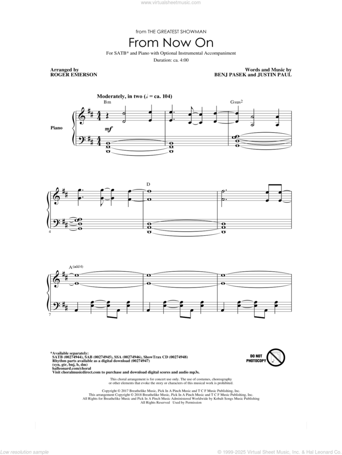This new feature (still experimental) allows you to ask questions related to this music title to our AI music assistant (powered by OpenAI ChatGPT), trained to answer as an expert on this music title.You may ask questions like "When was this song written?" or "How would you suggest approaching this song?" You can also ask questions about the author or anything else you may think of. Just enter your queries inside the field on the top of the displayed music and click the "Ask" button on the left to start chatting. Remember that the assistant cannot perform catalog searches. It is focused only on this music title. It could also give you wrong or imperfect answers. In that case, click the "regenerate" button on the side of the answer to replace it with a new one. And, of course, you can provide feedback for each answer so we can improve the system. ![]() Benj Pasek: From Now On (from The Greatest Showman) (arr. Roger Emerson) for choir (SATB: soprano, alto, tenor, bass), intermediate sheet music. Includes an High-Quality PDF file to download instantly. Licensed to Virtual Sheet Music® by Hal Leonard® publishing company. NOTE: The image above is just a preview of the first page of this item. Buy this item to display, print, and enjoy the complete music. Basic Score Info