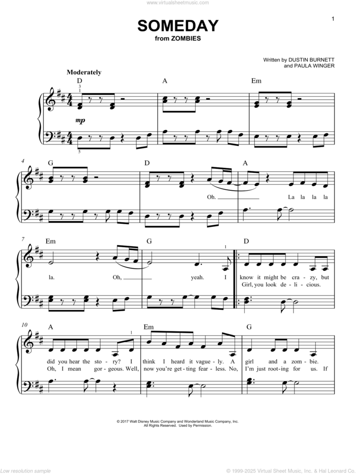 This new feature (still experimental) allows you to ask questions related to this music title to our AI music assistant (powered by OpenAI ChatGPT), trained to answer as an expert on this music title.You may ask questions like "When was this song written?" or "How would you suggest approaching this song?" You can also ask questions about the author or anything else you may think of. Just enter your queries inside the field on the top of the displayed music and click the "Ask" button on the left to start chatting. Remember that the assistant cannot perform catalog searches. It is focused only on this music title. It could also give you wrong or imperfect answers. In that case, click the "regenerate" button on the side of the answer to replace it with a new one. And, of course, you can provide feedback for each answer so we can improve the system. ![]() Dustin Burnett: Someday (from Disney's Zombies) for piano solo, easy piano sheet music. High-Quality and Interactive, transposable in any key, play along. Includes an High-Quality PDF file to download instantly. Licensed to Virtual Sheet Music® by Hal Leonard® publishing company. NOTE: The sample above is just the first page preview of this item. Buy this item to display, print, and play the complete music. Basic Score Info