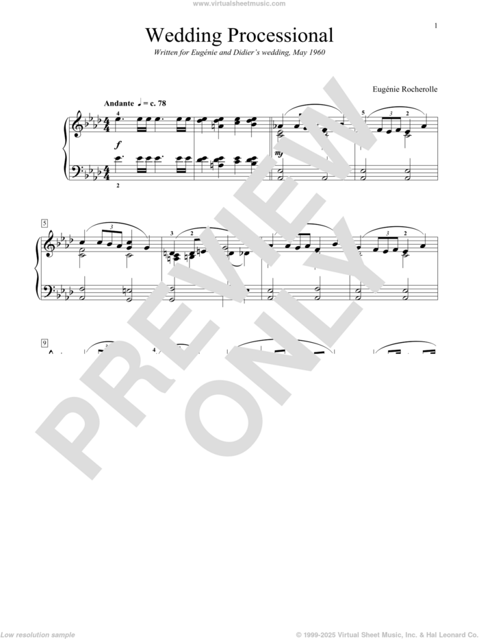 This new feature (still experimental) allows you to ask questions related to this music title to our AI music assistant (powered by OpenAI ChatGPT), trained to answer as an expert on this music title.You may ask questions like "When was this song written?" or "How would you suggest approaching this song?" You can also ask questions about the author or anything else you may think of. Just enter your queries inside the field on the top of the displayed music and click the "Ask" button on the left to start chatting. Remember that the assistant cannot perform catalog searches. It is focused only on this music title. It could also give you wrong or imperfect answers. In that case, click the "regenerate" button on the side of the answer to replace it with a new one. And, of course, you can provide feedback for each answer so we can improve the system. ![]() Eugenie Rocherolle: Wedding Processional for piano solo, intermediate piano sheet music. High-Quality and Interactive, transposable in any key, play along. Includes an High-Quality PDF file to download instantly. Licensed to Virtual Sheet Music® by Hal Leonard® publishing company. NOTE: The sample above is just the first page preview of this item. Buy this item to display, print, and play the complete music. Basic Score Info
